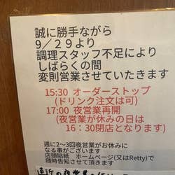 只今調理スタッフ不足の為15:30〜17:00料理提供ストップさせて頂いております